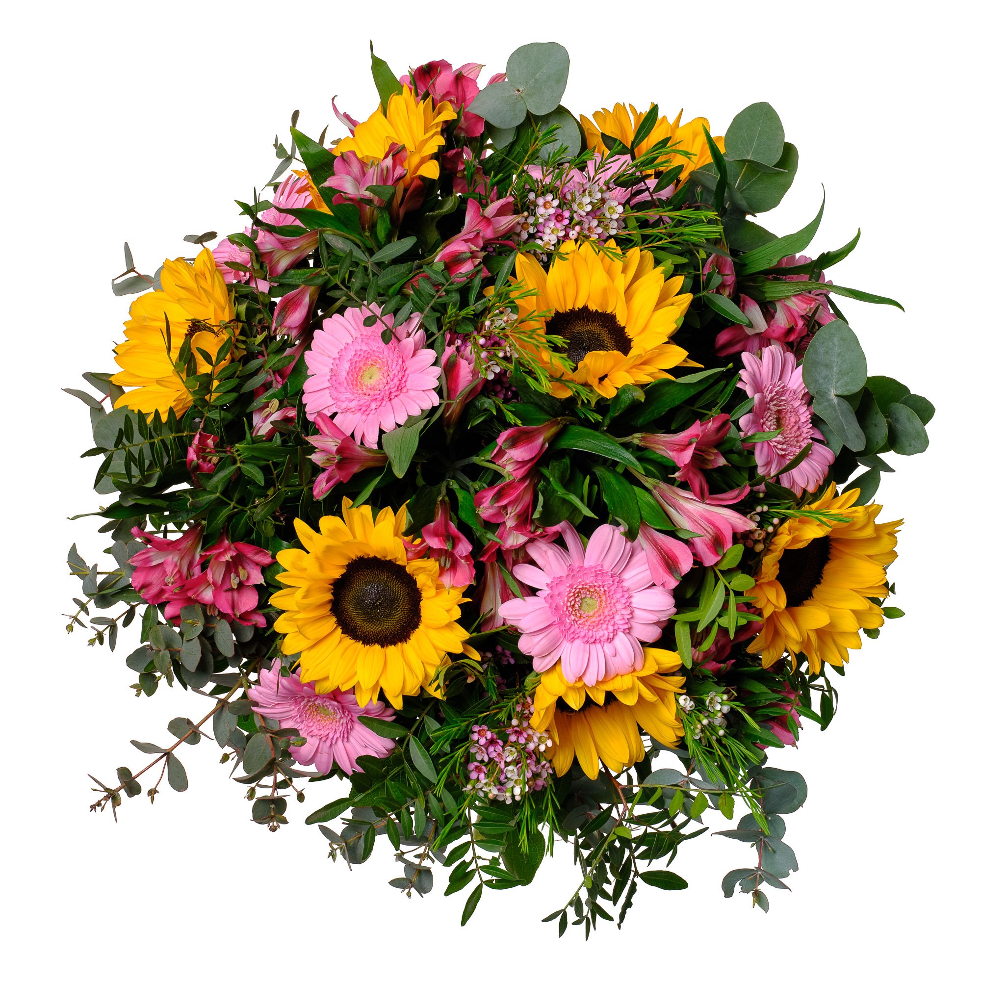 | Exclusive | Sunflowers, Alstroemerias, Mini Gerberas, Waxflower & Decorative greenery (25 stems) |